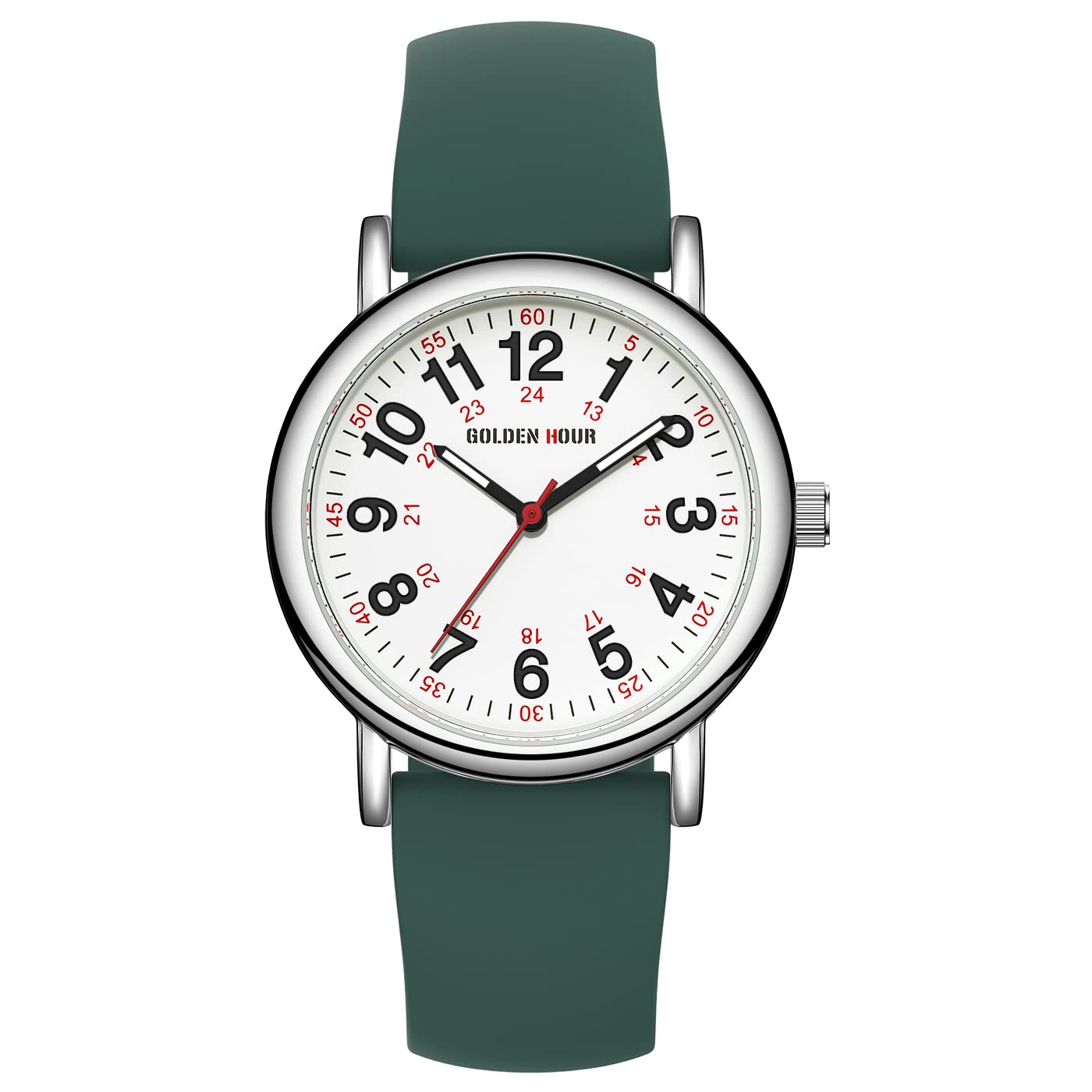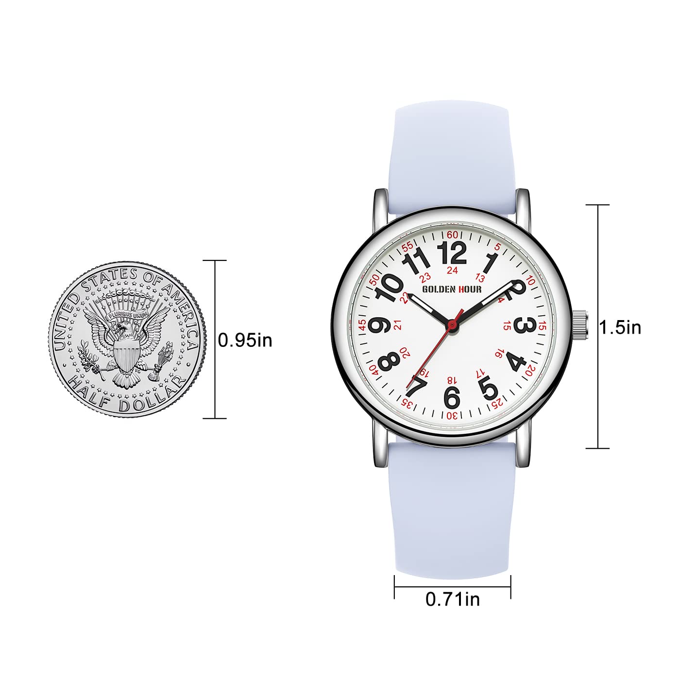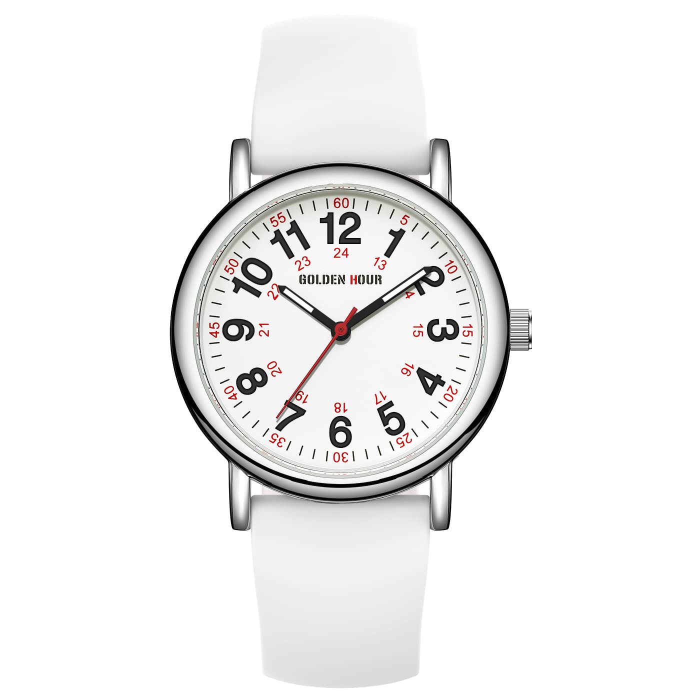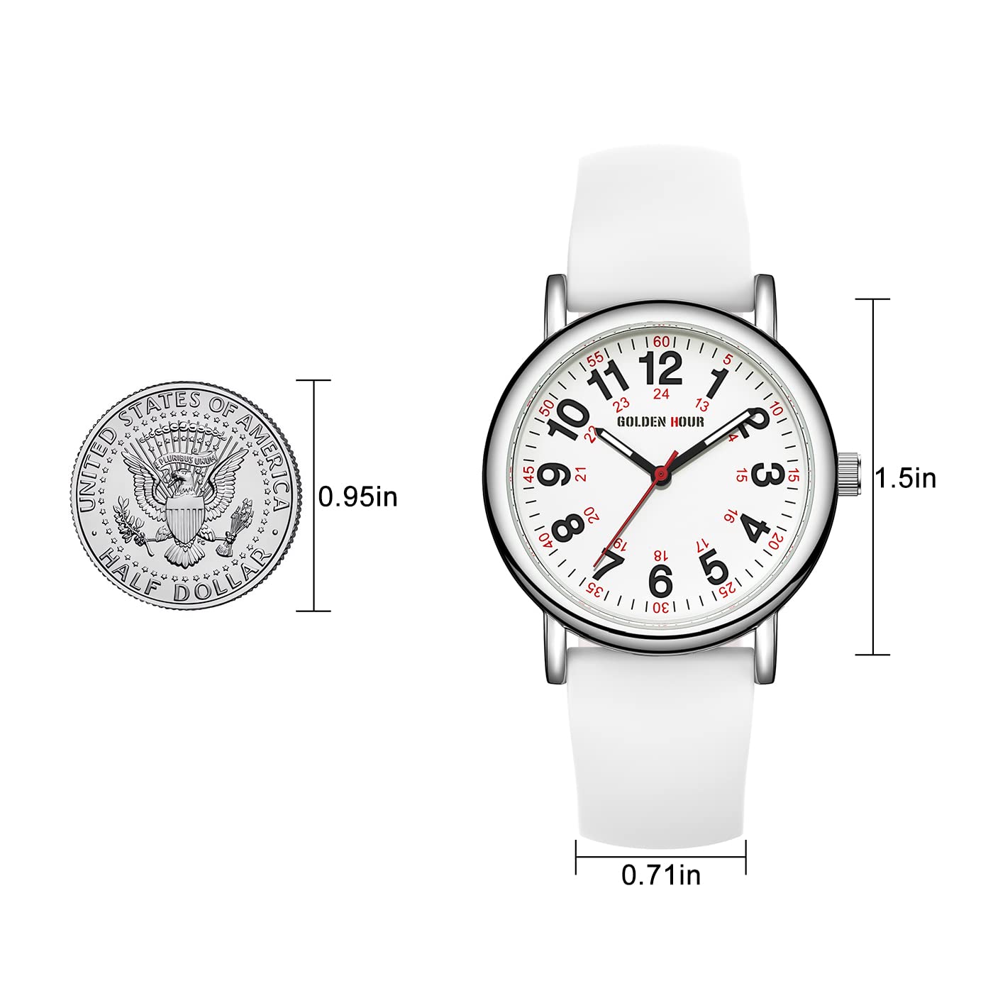 GOLDEN HOUR 방수 간호사 시계는 의료 종사자와 학생을 위해 설계된 아날로그 메디컬 워치입니다. 화이트 다이얼에 12시간 및 24시간(밀리터리 타임) 표기가 함께 적용되어 근무 중 빠르고 정확하게 시간을 확인할 수 있습니다.