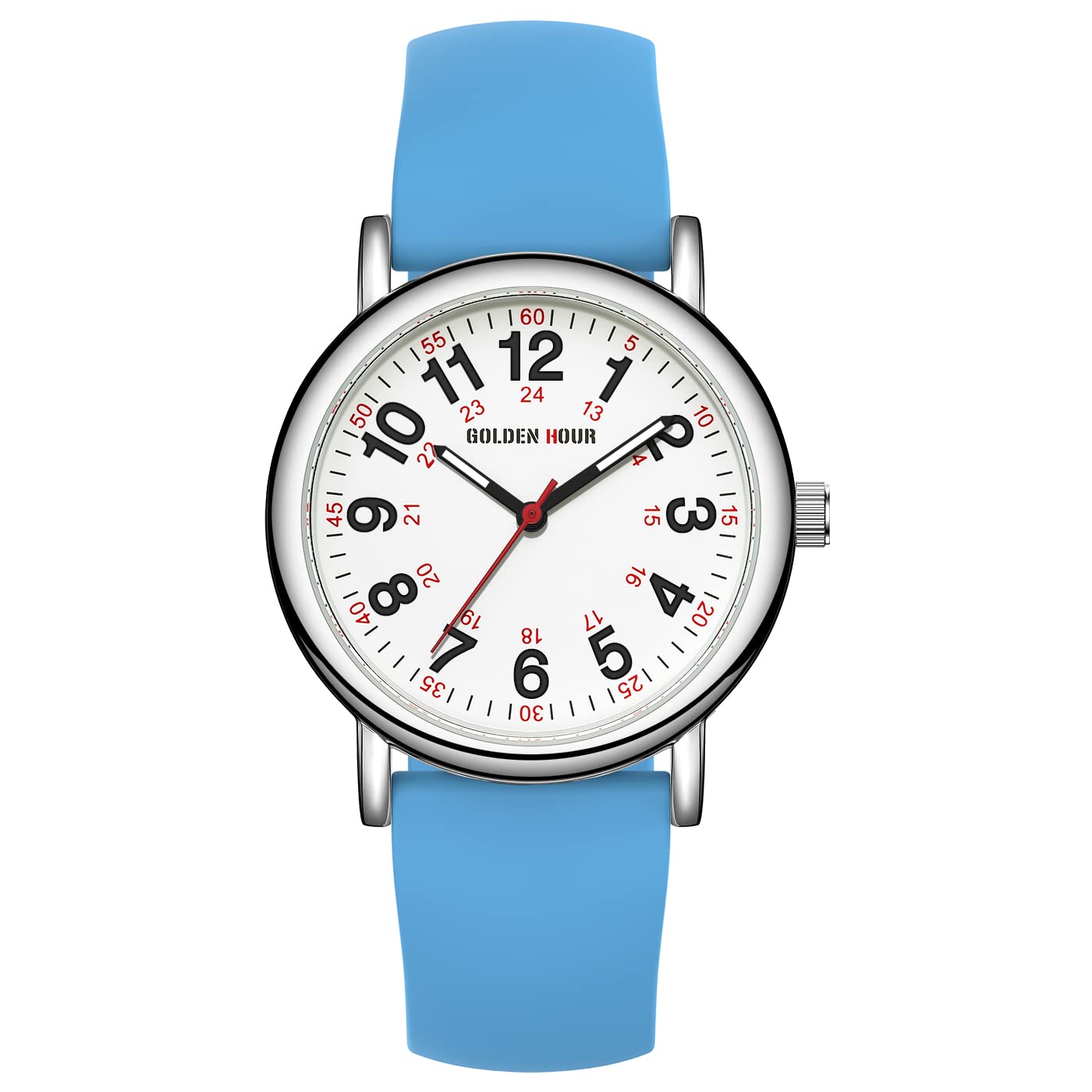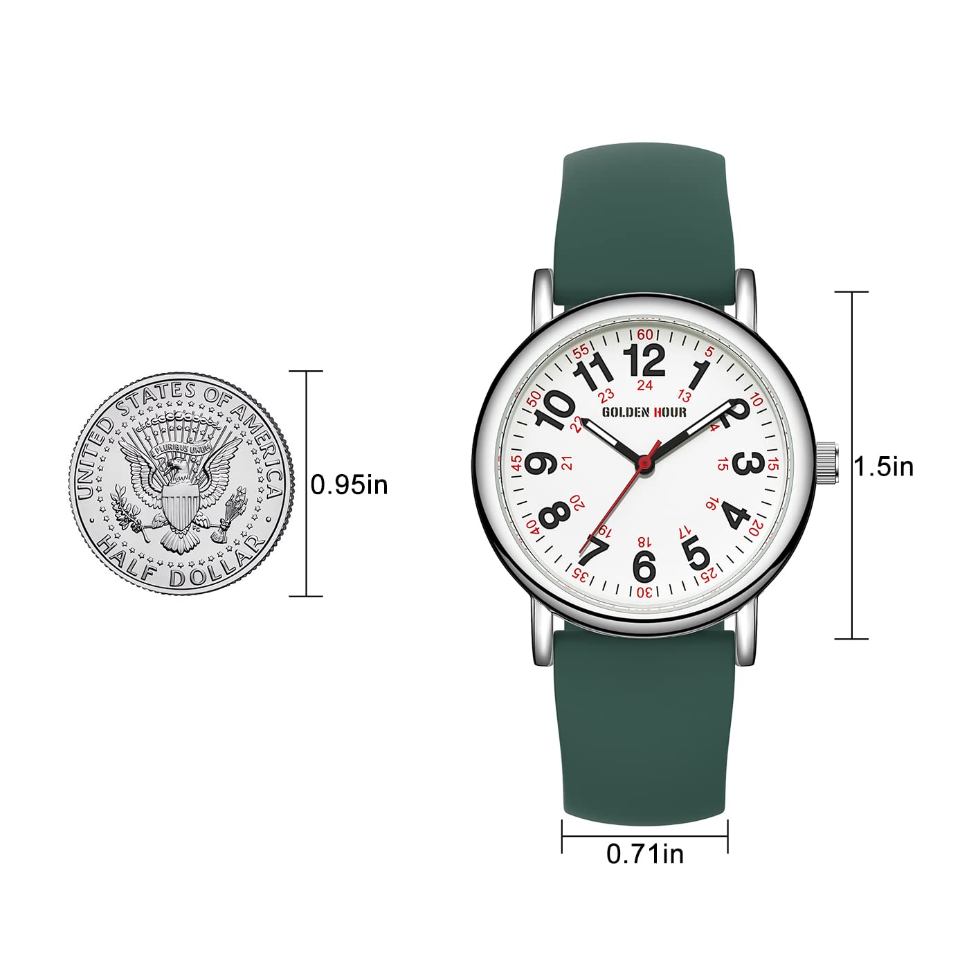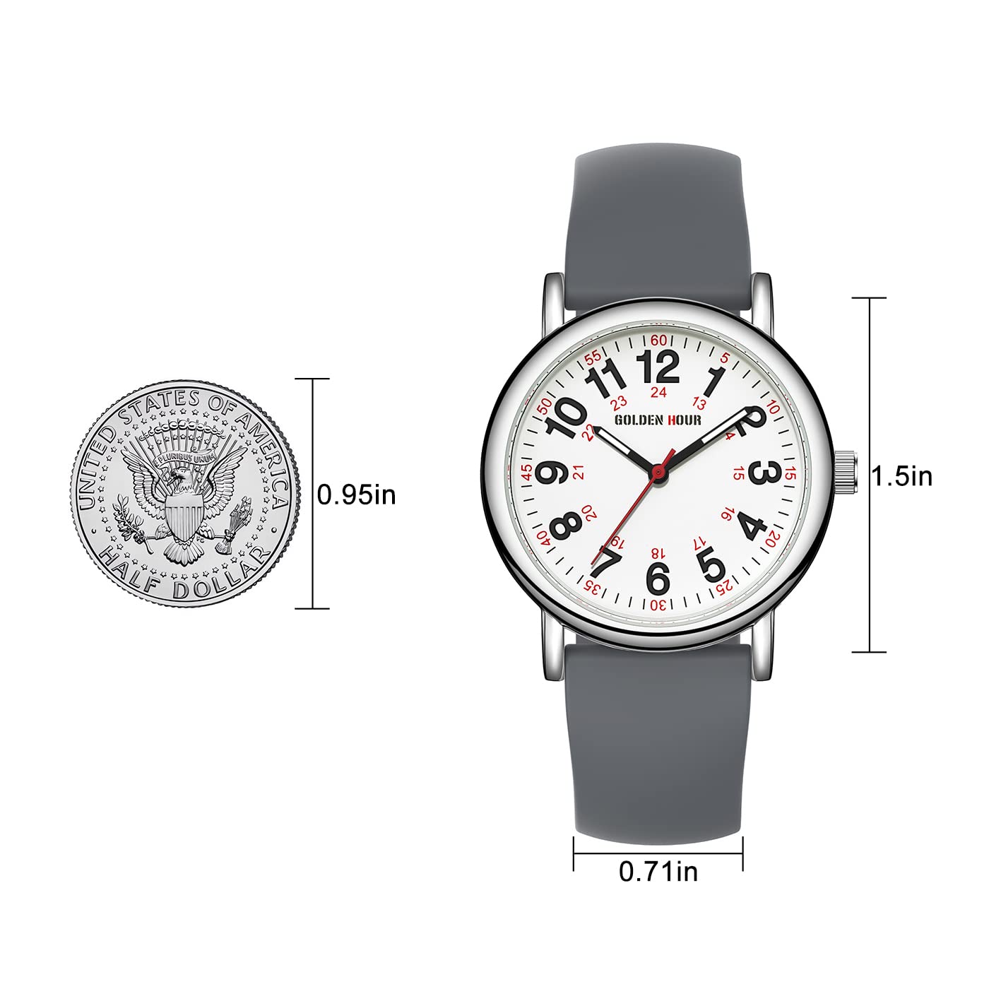 GOLDEN HOUR 방수 간호사 시계는 의료 종사자와 학생을 위해 설계된 아날로그 메디컬 워치입니다. 화이트 다이얼에 12시간 및 24시간(밀리터리 타임) 표기가 함께 적용되어 근무 중 빠르고 정확하게 시간을 확인할 수 있습니다.