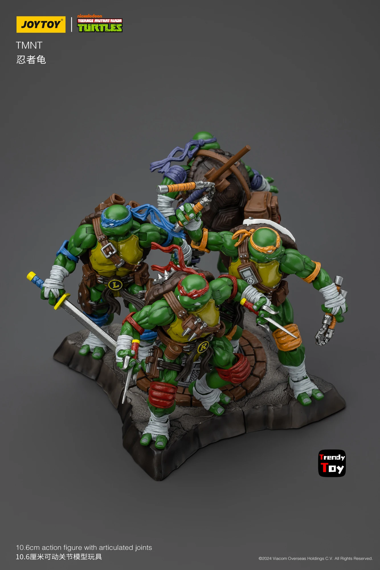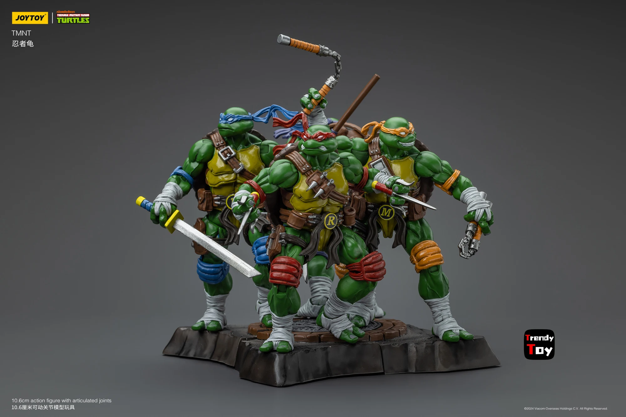 This JOYTOY TMNT 1/18 scale action figure set features Donatello, Raphael, Leonardo, and Michelangelo with detailed sculpting and hand-painted finishes.