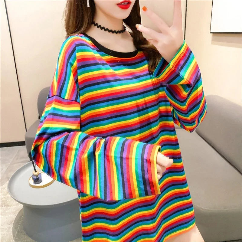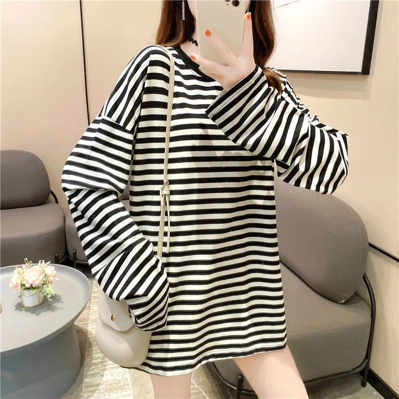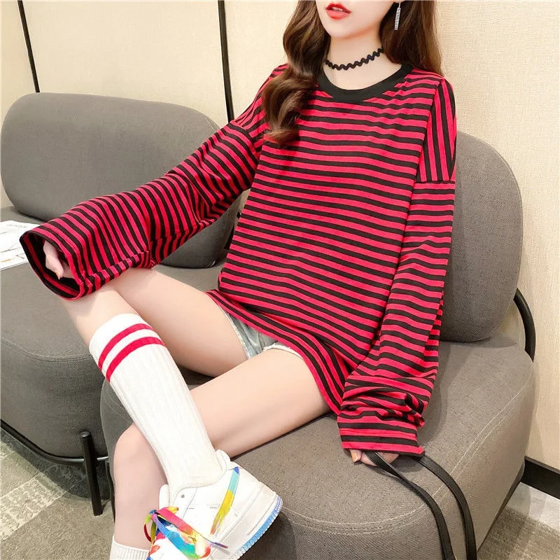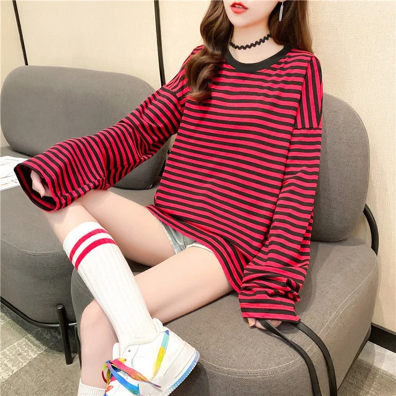 This KOSAHIKI women’s loose striped long sleeve T-shirt features an oversized silhouette and trendy Korean-style design.