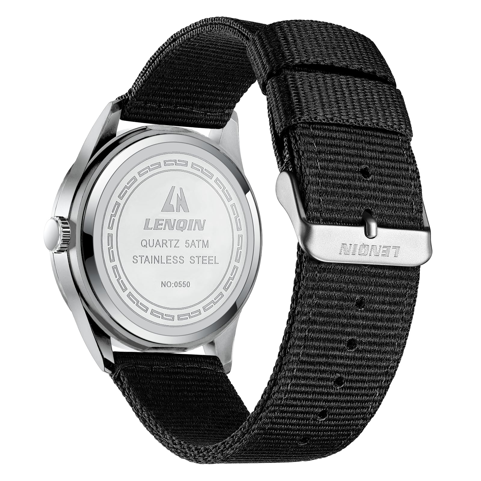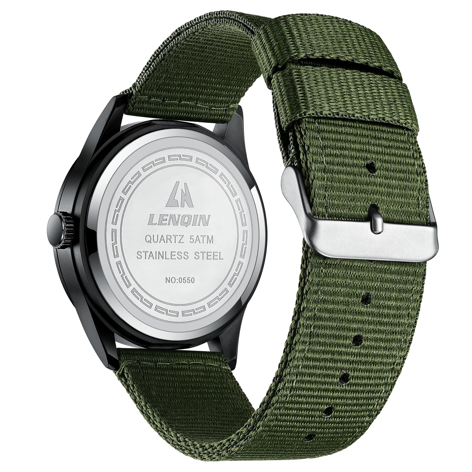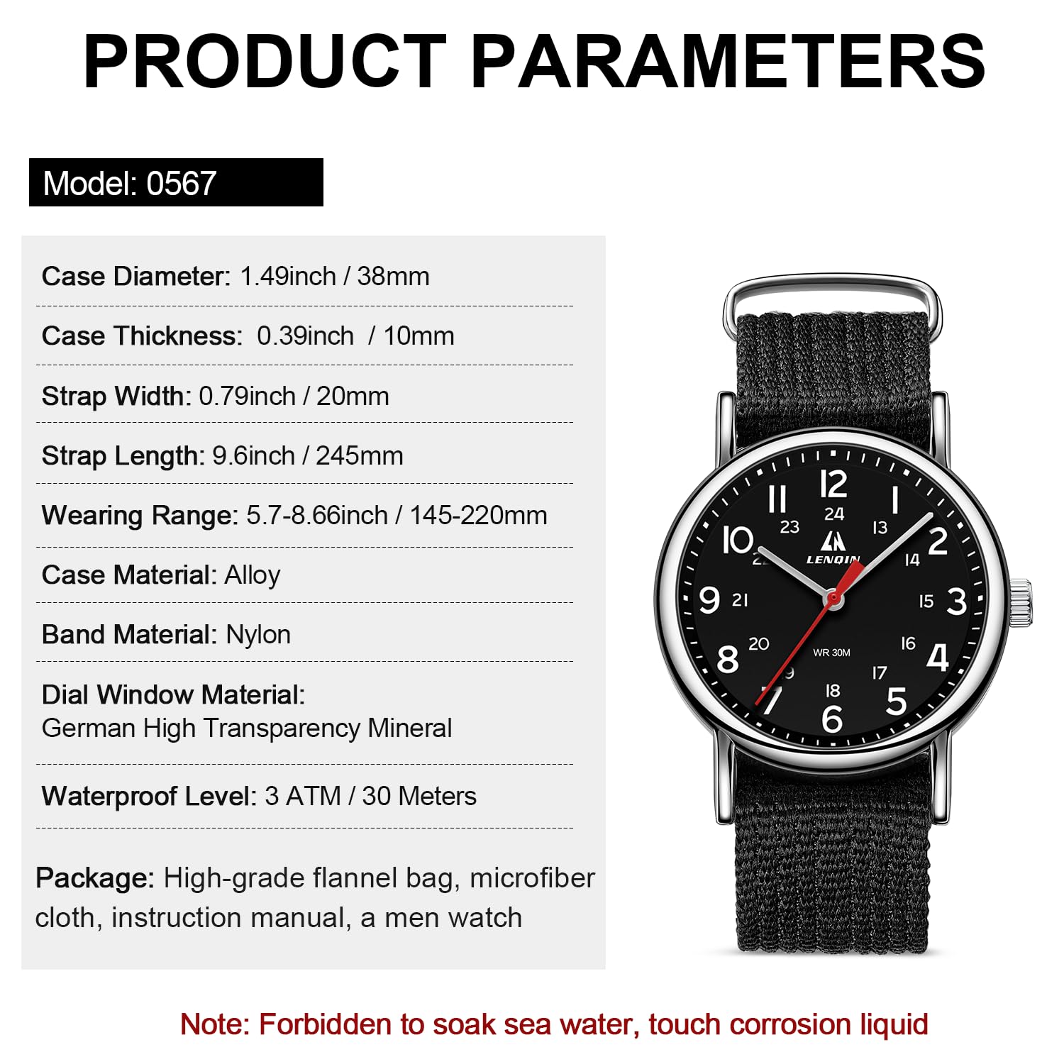 충격에 강한 스테인리스 스틸 케이스와 스크래치에 강한 미네랄 글라스 창을 적용한 LN LENQIN 밀리터리 아날로그 시계입니다. 42mm 케이스(약 1.65인치)와 22mm(약 0.86인치) 더블 나일론 스트랩으로 안정감 있는 착용감을 제공합니다.
