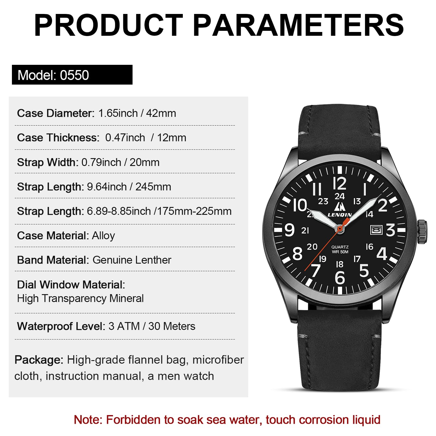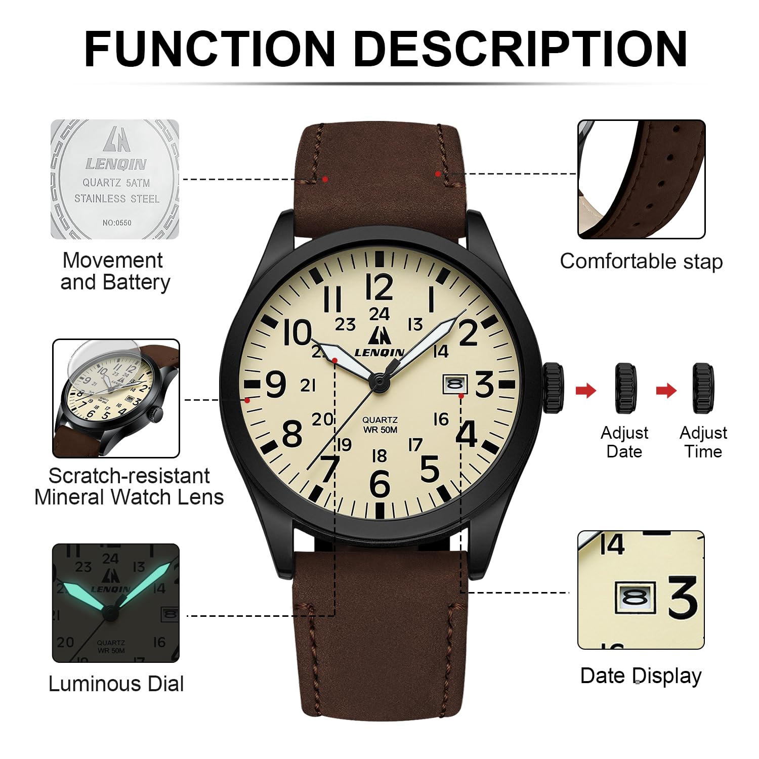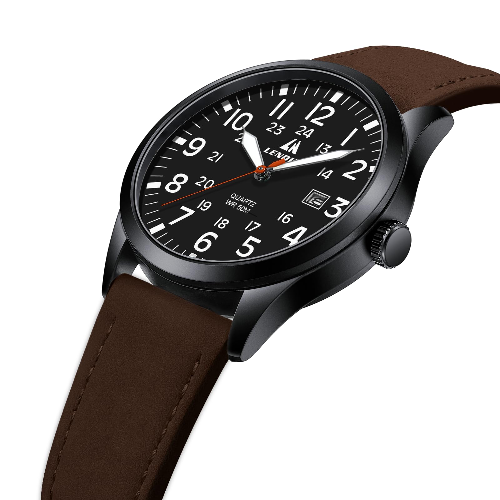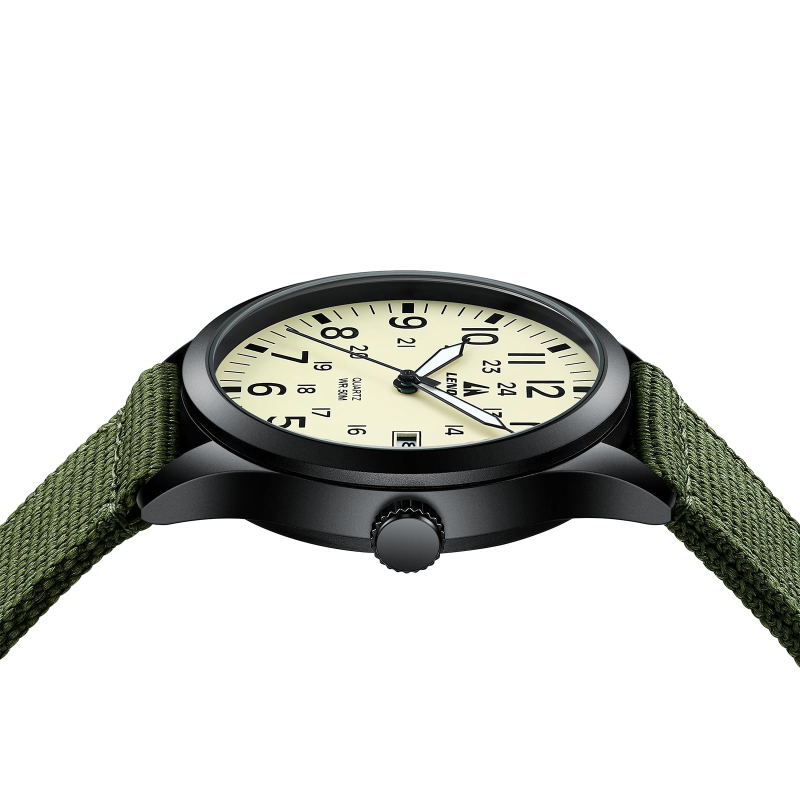 충격에 강한 스테인리스 스틸 케이스와 스크래치에 강한 미네랄 글라스 창을 적용한 LN LENQIN 밀리터리 아날로그 시계입니다. 42mm 케이스(약 1.65인치)와 22mm(약 0.86인치) 더블 나일론 스트랩으로 안정감 있는 착용감을 제공합니다.