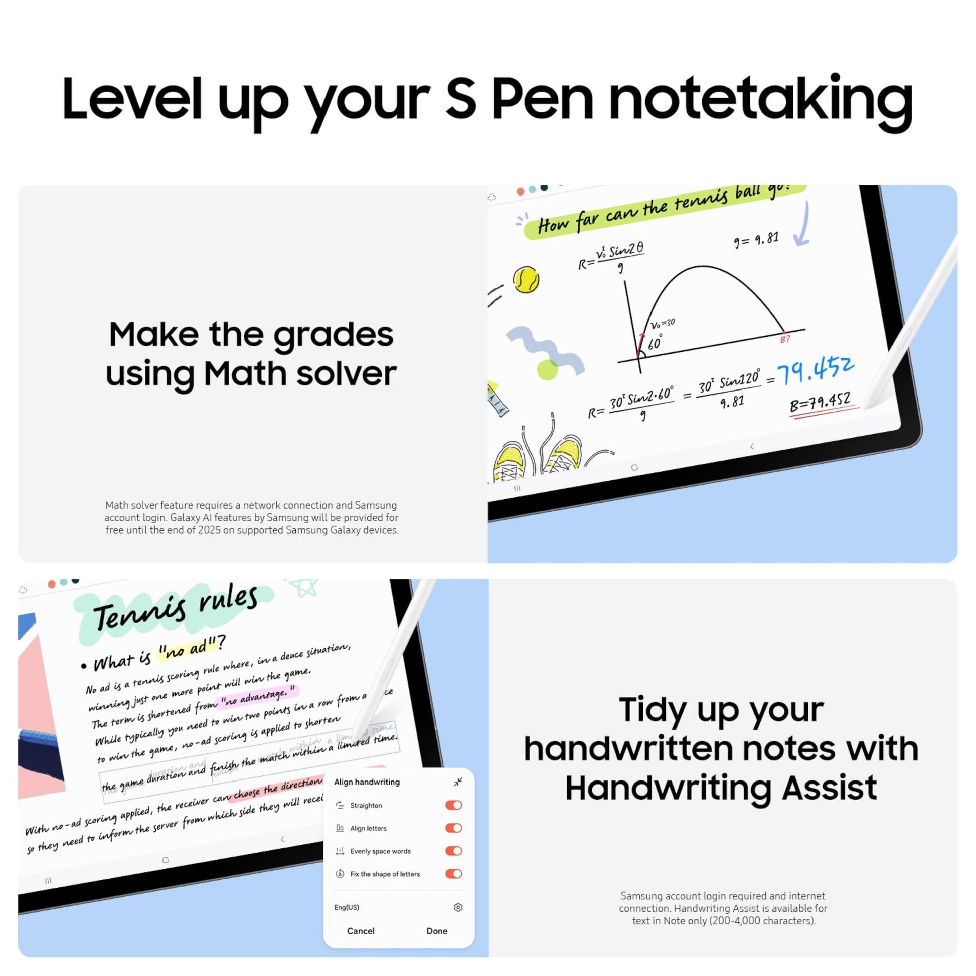 S Pen이 기본 포함되어 필기, 드로잉, 메모 작성이 자연스럽게 가능합니다. Handwriting Assist 기능으로 손글씨를 정리해주며, Math Solver 기능을 통해 수식을 자동 정리할 수 있어 학습용 태블릿으로도 적합합니다.
