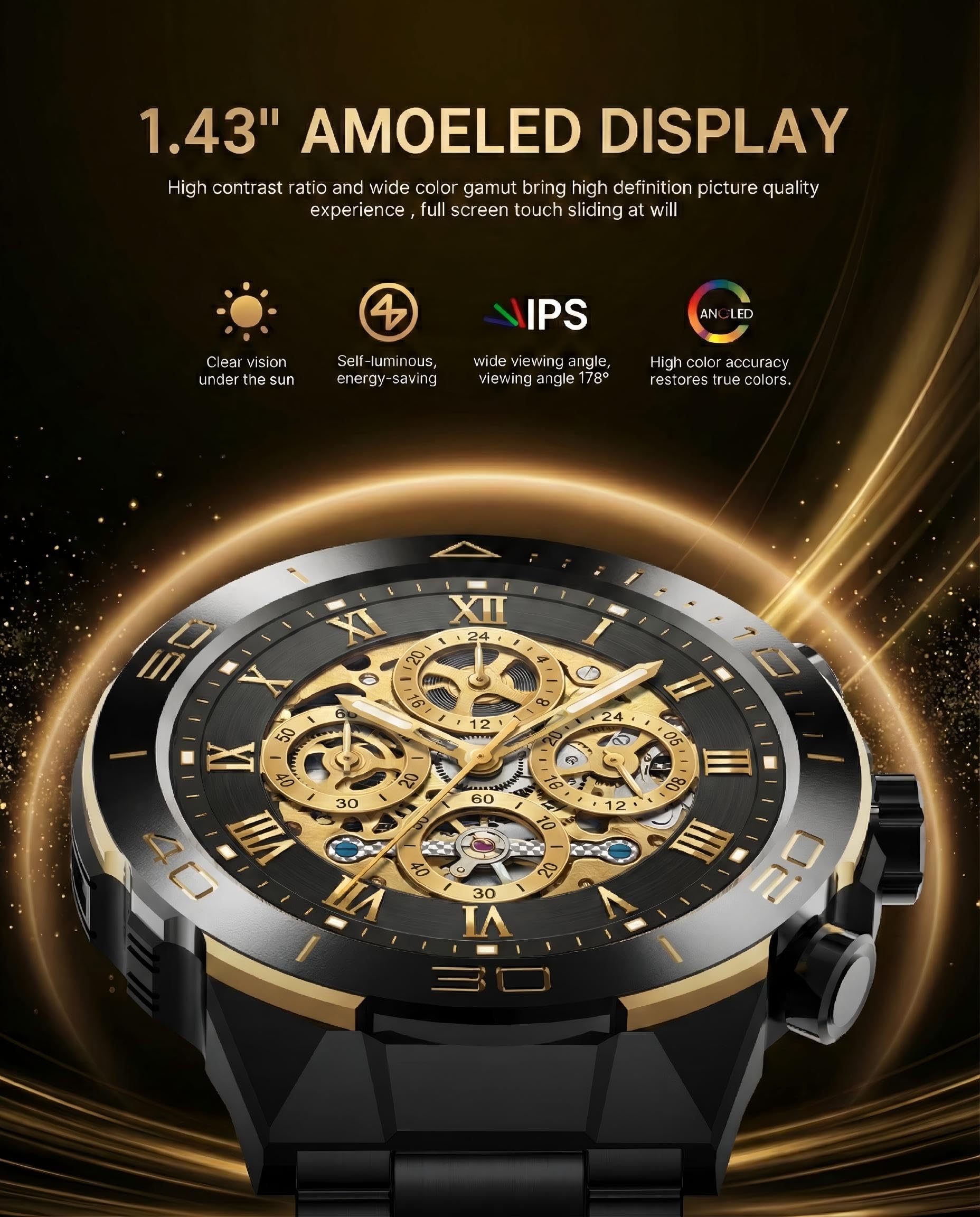 AMOLED HD DISPLAY 466×466 resolution with always-on support for vivid and clear visuals.