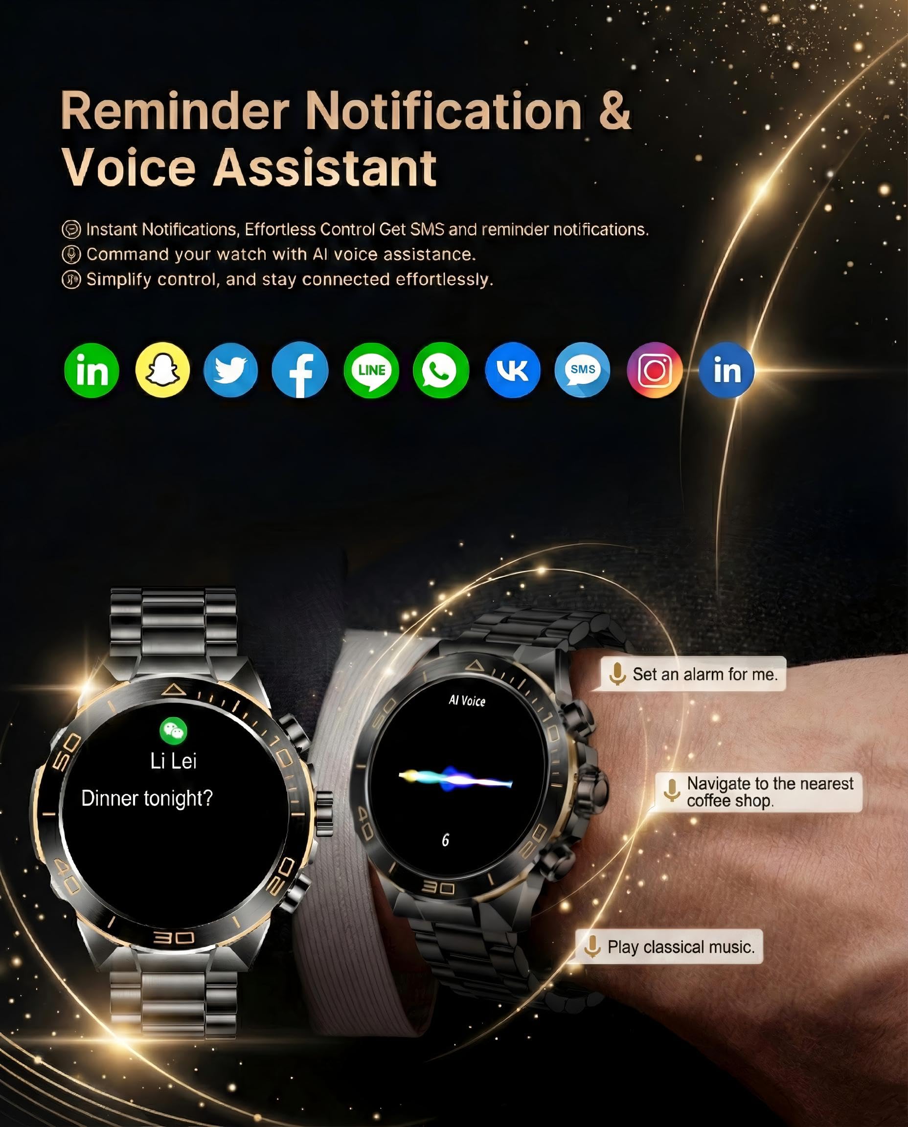 블루투스 통화 기능을 지원해 워치에서 직접 전화 수·발신 및 거절, 통화 기록 확인이 가능합니다. SMS 및 주요 SNS 앱 알림 수신을 지원하며, 음성 어시스턴트 기능도 포함되어 있습니다.